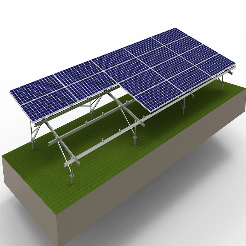 Pemasangan di Tanah adalah solusi yang mencakup struktur baja dan komponen aluminium. Cocok untuk pembangkit listrik tenaga surya skala kecil dan besar.